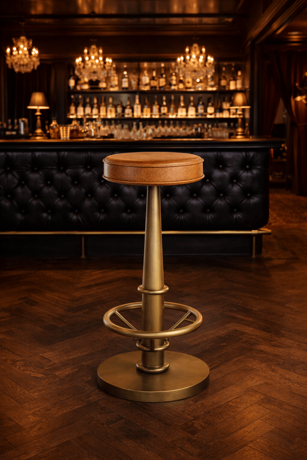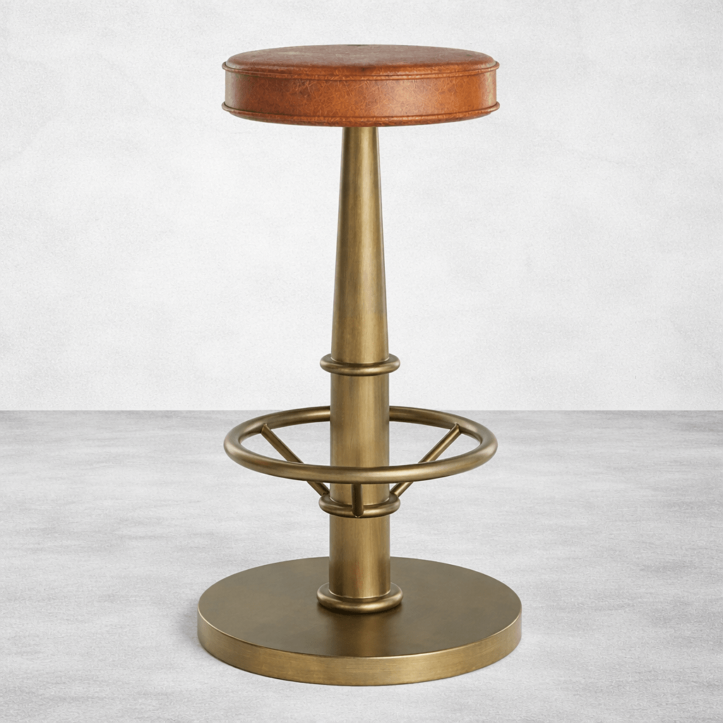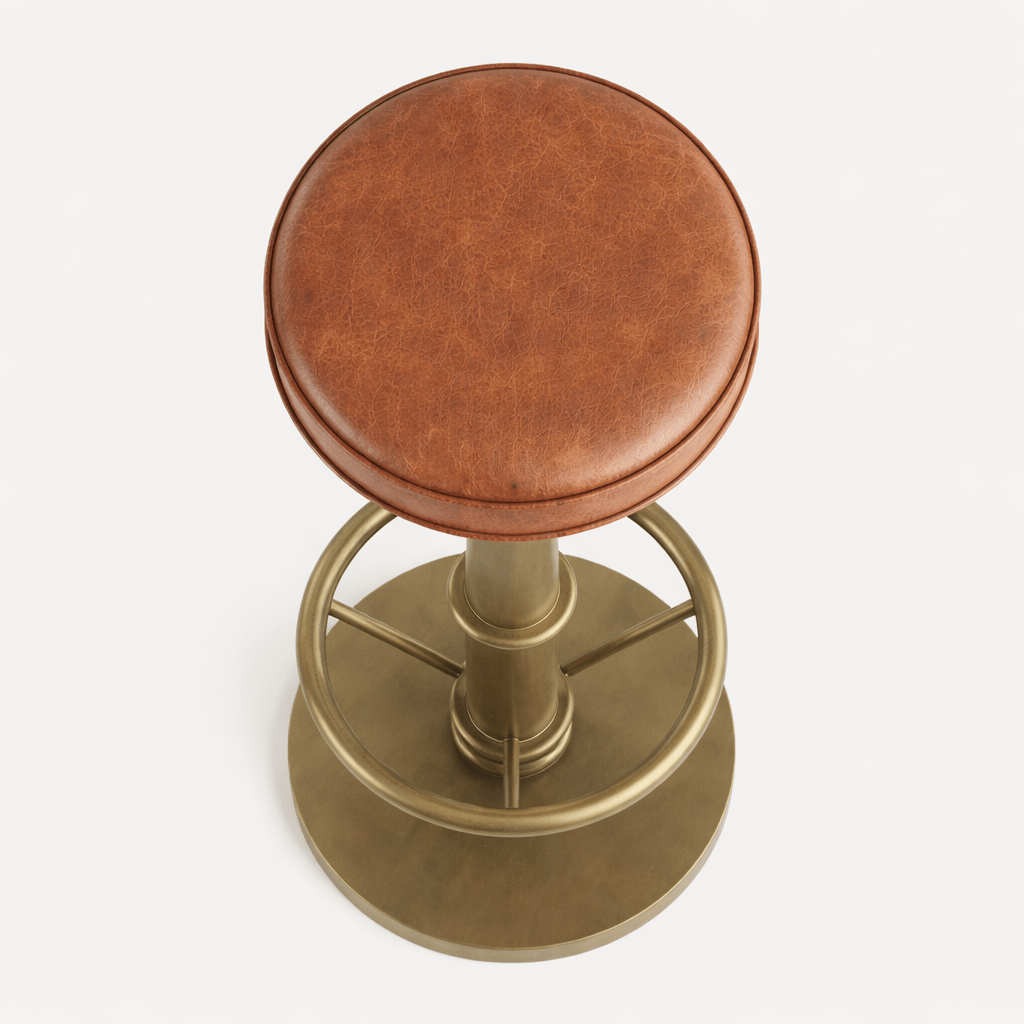 The seating experience is defined by a plush, circular cushion upholstered in top-grain cognac leather. The rich, earthy tones of the leather provide a striking contrast against the brass, developing a beautiful patina over time that tells the story of your home. With its generous padding and supportive frame, this stool ensures that your morning coffee or evening cocktails are enjoyed in absolute comfort.