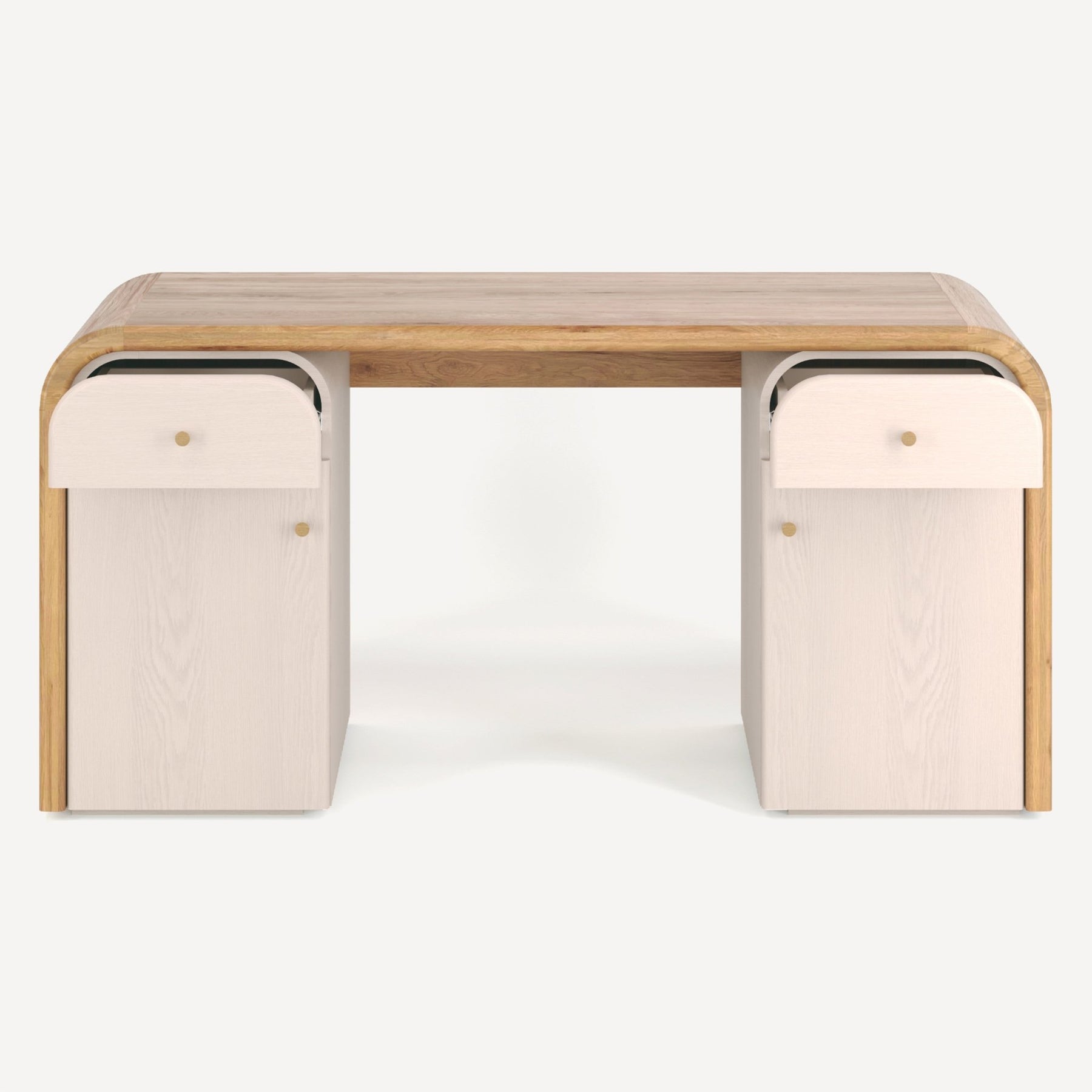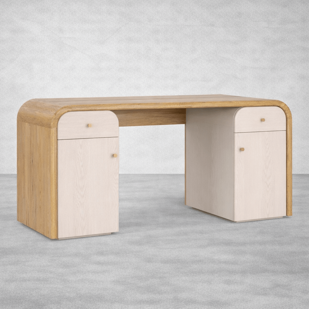 Elevating the design is a sophisticated two-tone finish. While the outer shell showcases the rich, honeyed grain of natural oak, the dual storage pedestals are finished in a contrasting bleached ash veneer. This subtle shift in wood tones adds layers of visual interest and modern refinement, ensuring the desk anchors a room without overwhelming it.