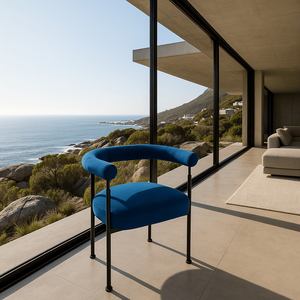 Curaçao color, provides ultimate comfort and support. The matte black frame adds a touch of modernity and contrasts perfectly with the soft and plush fabric, just like the smooth and indulgent White Russian cocktail.
