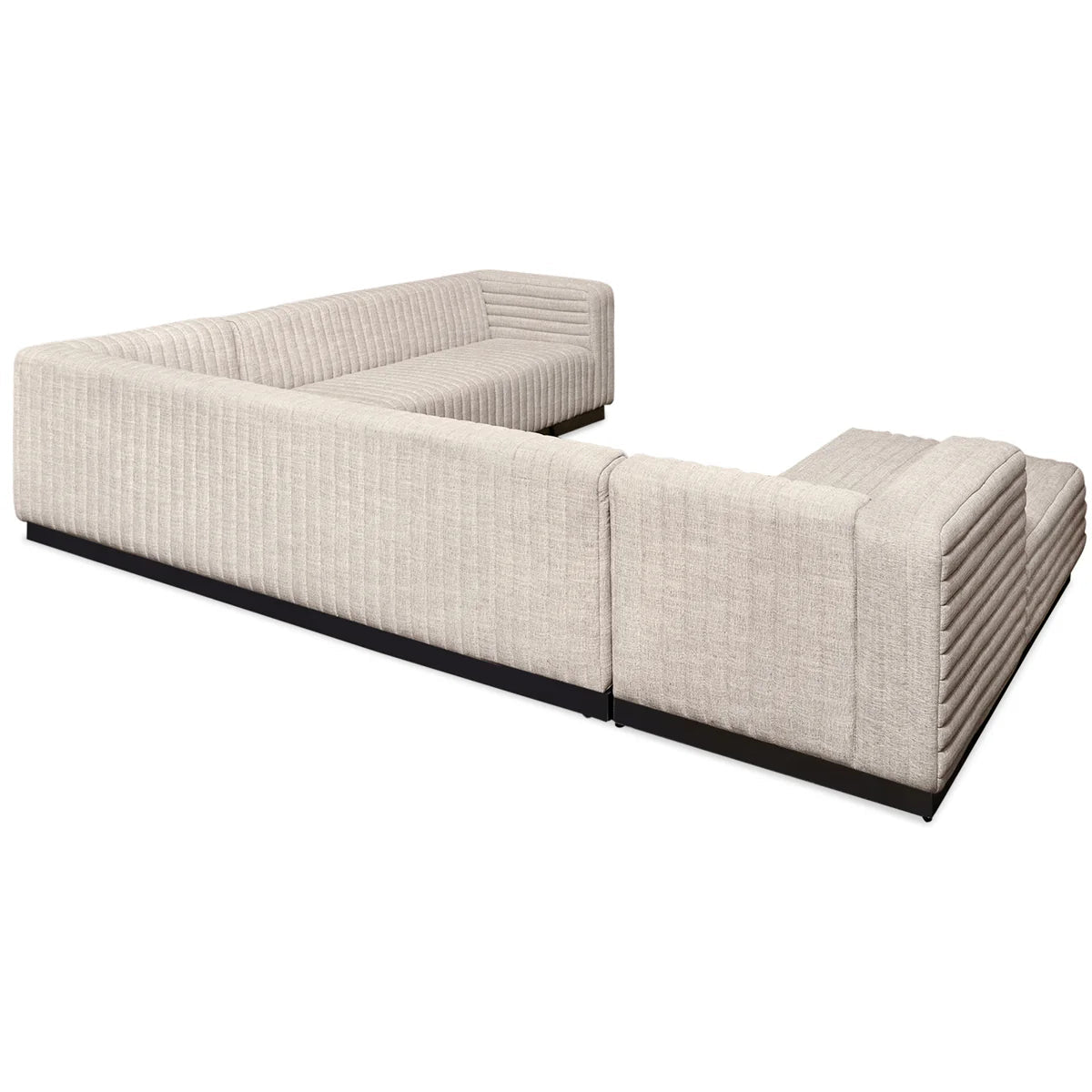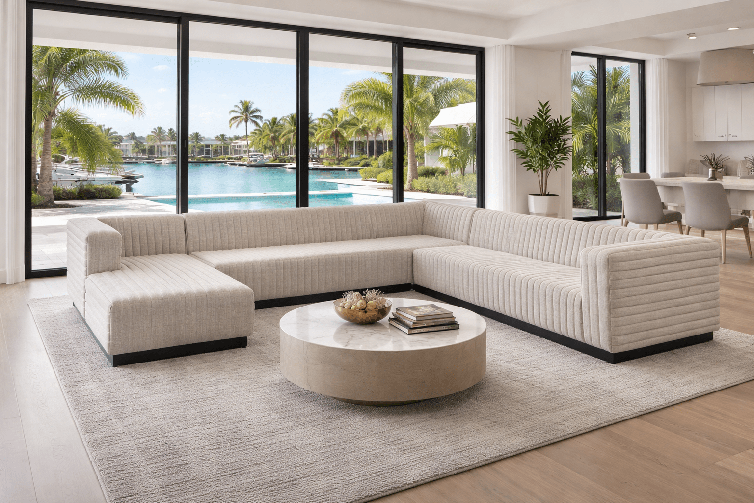 A sleek, low base grounds the piece, giving it a clean, streamlined appearance that keeps the focus on its generous seating and refined craftsmanship. Whether placed in an open-concept living room or used as a statement piece in a spacious lounge, the Coquito Sectional offers both versatility and impact.