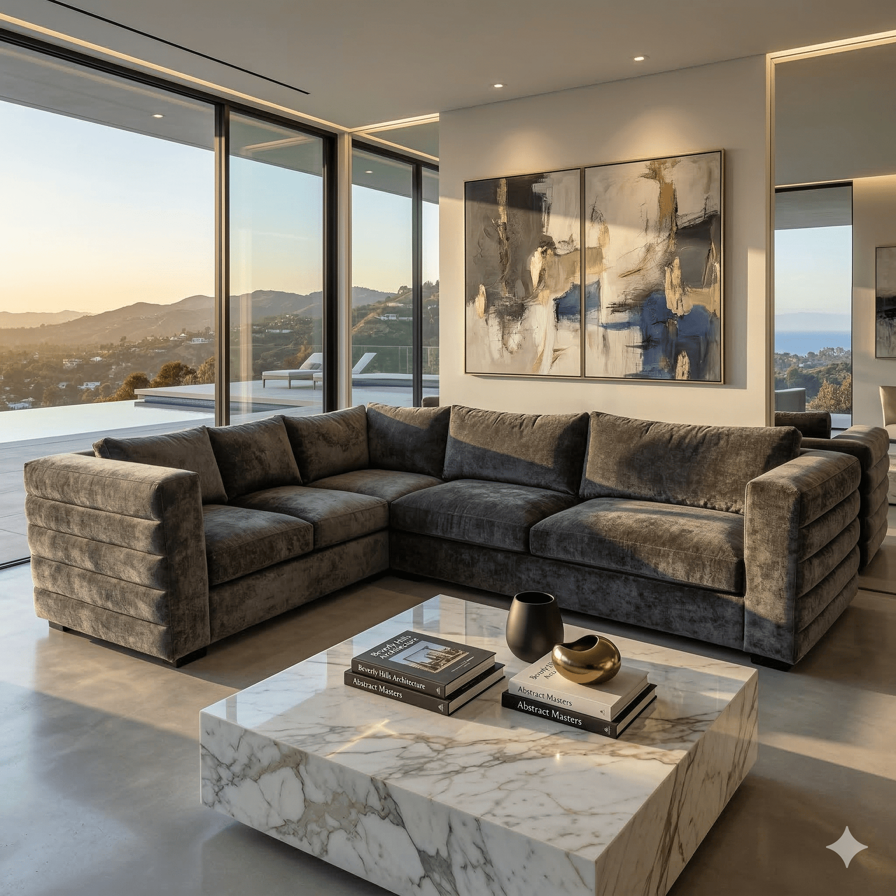 Meet the Luna Sectional Sofa in Charcoal Velour, designed to bring a touch of sophistication to your home. The sofa's rounded horizontal tufting at each end contrasts beautifully with its smooth, flat back. The charcoal velour fabric adds a rich, luxurious feel that enhances any modern or contemporary setting. Enjoy both style and comfort with the Luna Sectional, a perfect upgrade for your living space.