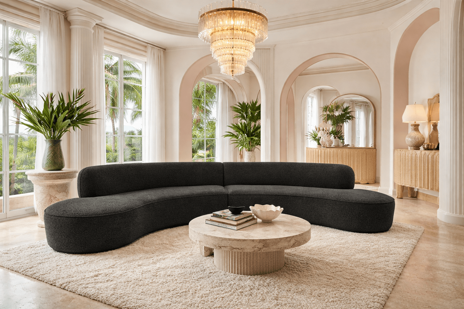 Bold, sculptural, and unapologetically modern, the Overture Sectional is a statement-making modern sectional sofa designed for expansive interiors and elevated living. Upholstered in rich Licorice Faux Sheepskin, this sectional delivers dramatic texture, depth, and visual intrigue while maintaining an inviting, tactile softness. Its sweeping curved silhouette and oversized proportions make it an ideal centerpiece for contemporary living rooms, modern lofts, and design-forward homes that embrace statement furniture.
