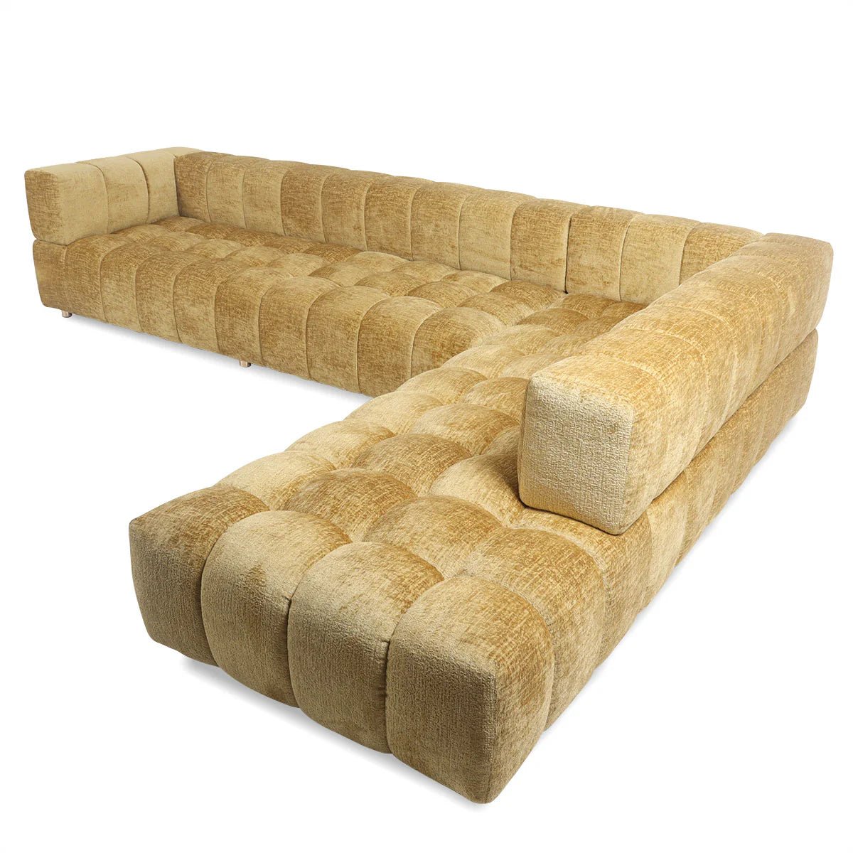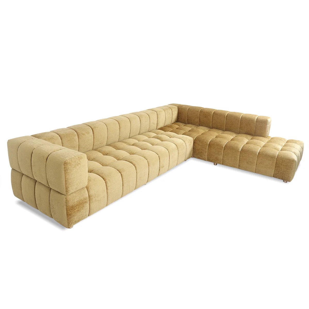 Deep, grid-style tufting across the seat, back, and arms creates a plush, cushioned appearance that feels both luxurious and relaxed. This detailed tufting emphasizes the sectional’s architectural design while inviting you to sink in and unwind. The textured chenille fabric further elevates the look, offering visual depth and a refined, high-end finish.