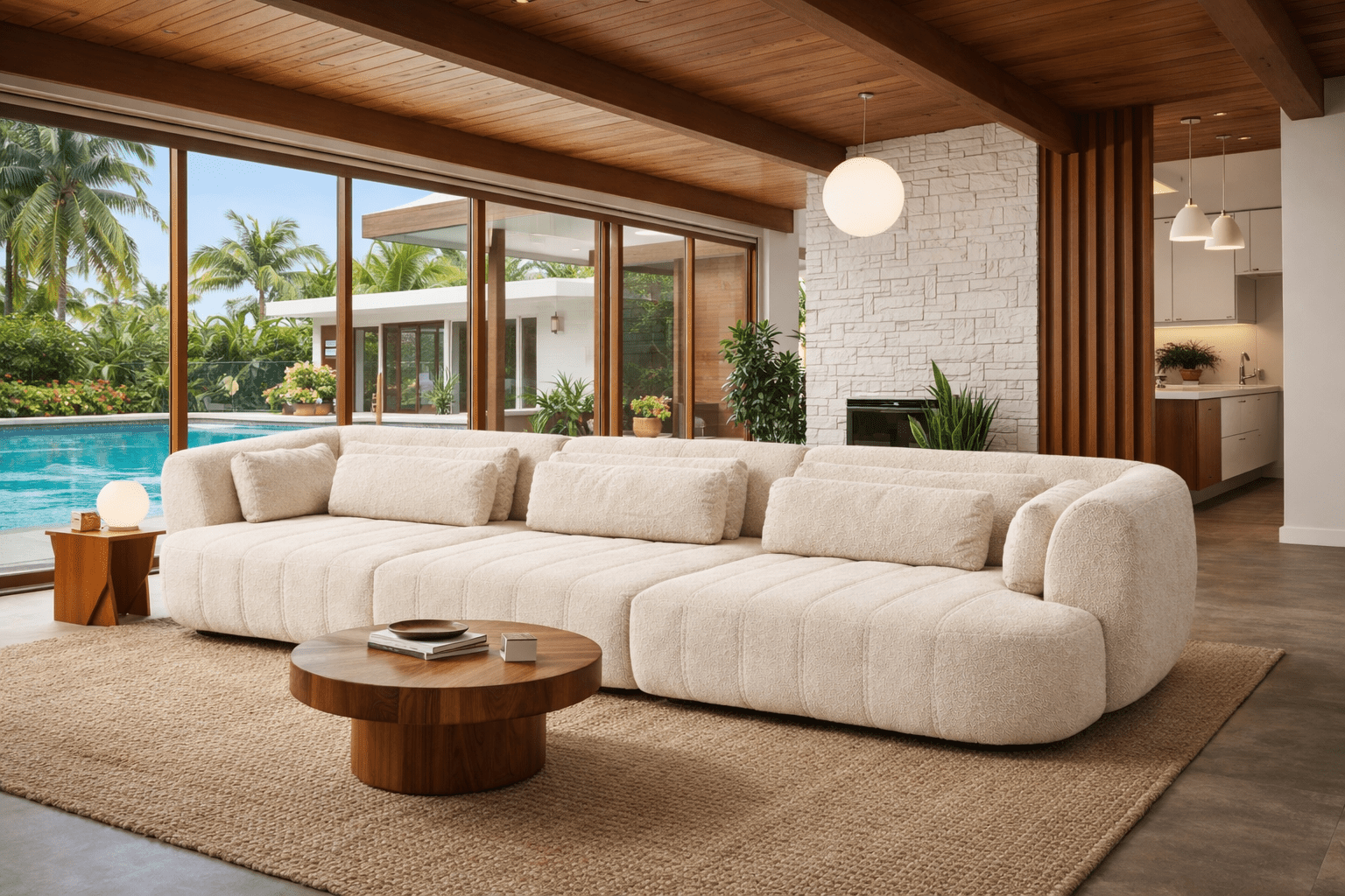 The entire piece is enveloped in a premium ivory performance bouclé. This high-textured upholstery offers a rich, sensorial experience, with its signature looped fibers providing a soft, cloud-like surface. The neutral palette ensures that despite its commanding size, the El Presidente maintains a sense of airy sophistication that complements any modern color story.
