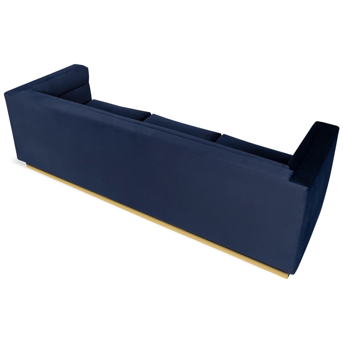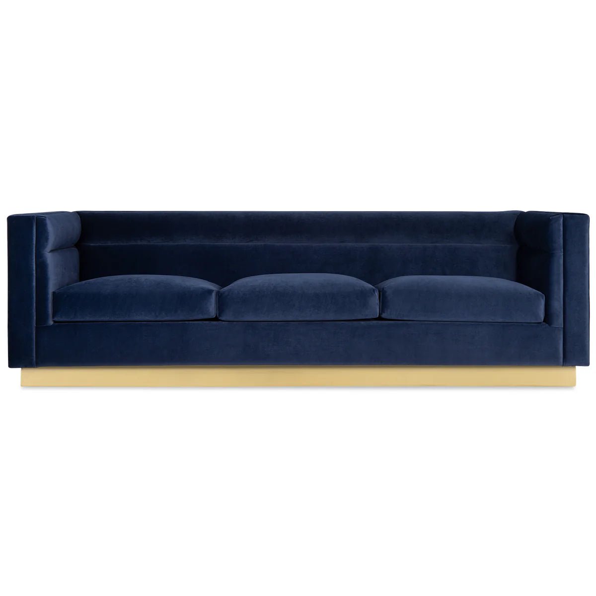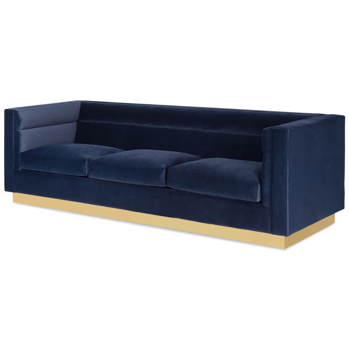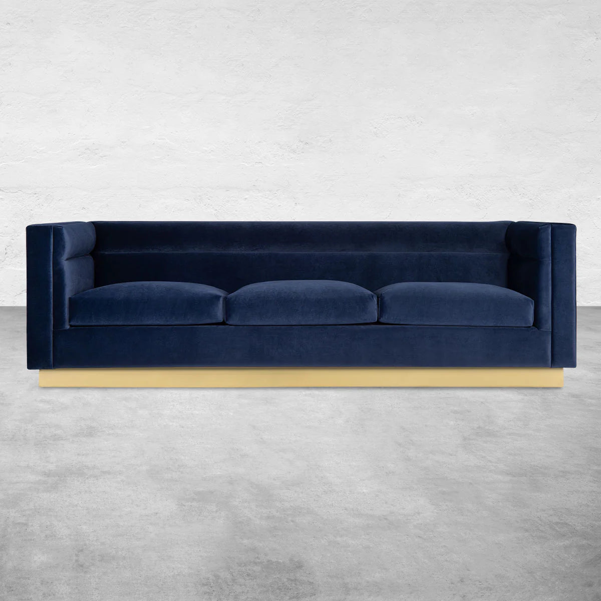 Upholstered in sumptuous velvet, the Rosso Fresco Sofa offers a soft, tactile surface with a subtle sheen that enhances its depth of color. The structured silhouette is defined by vertically channeled arms and a streamlined back, creating a tailored, sophisticated look that feels both timeless and modern. A polished metal base runs the full length of the sofa, adding a striking contrast and elevating the overall design with a touch of glamour.